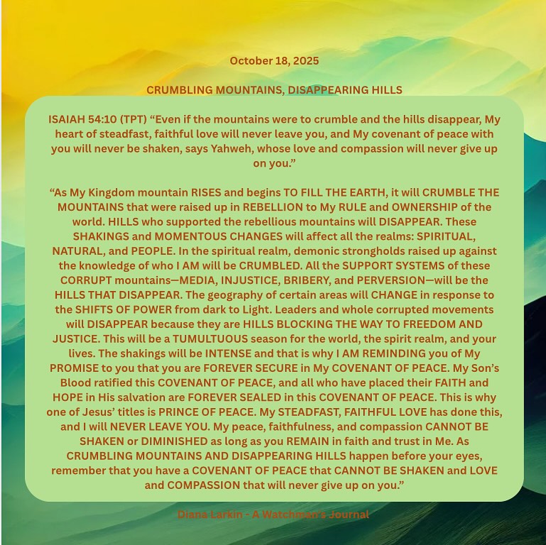 Diana Larkin is the founder of A Watchman's Journal ministry. She has been journaling the Father’s voice for decades. Her favorite part of the day is the morning, when she draws away to sit at His feet and to hear what is on His heart.